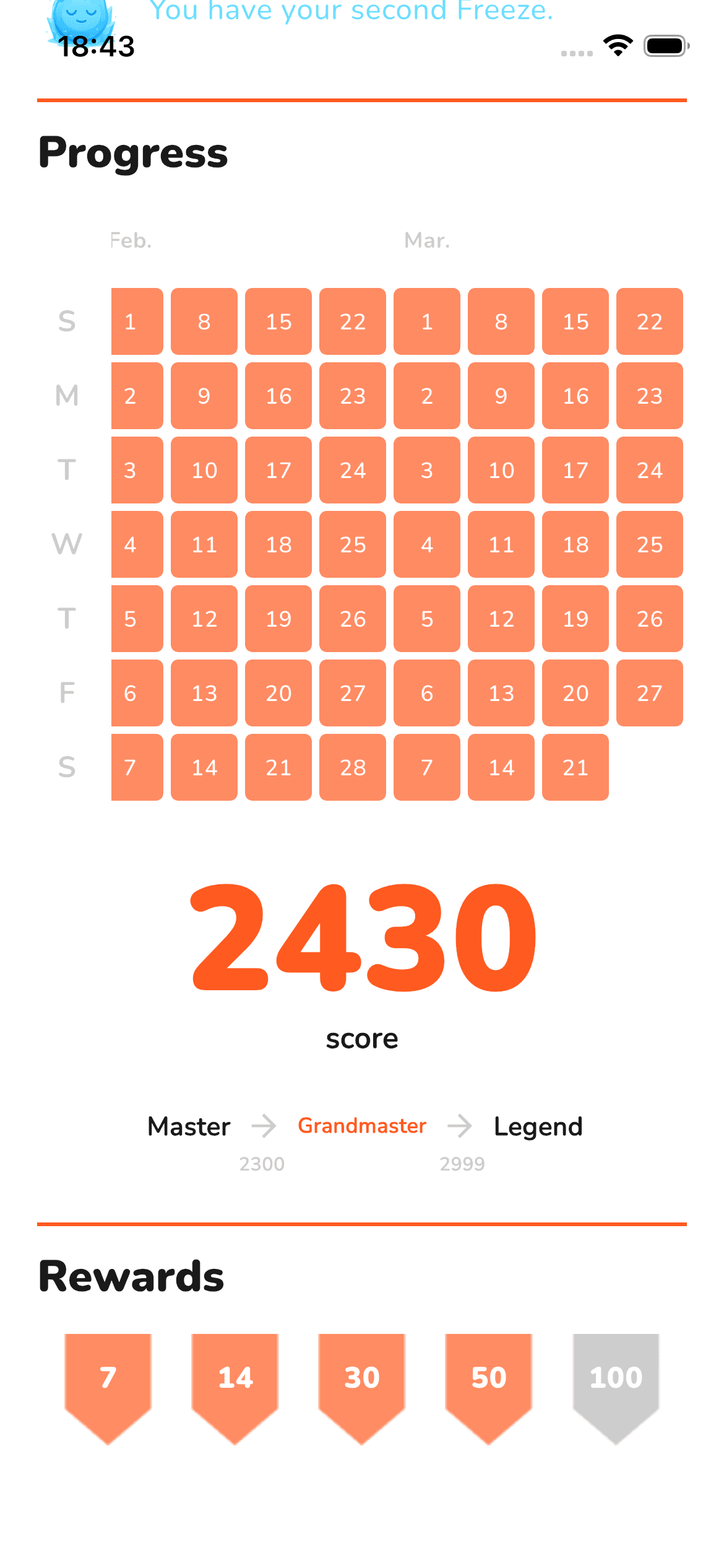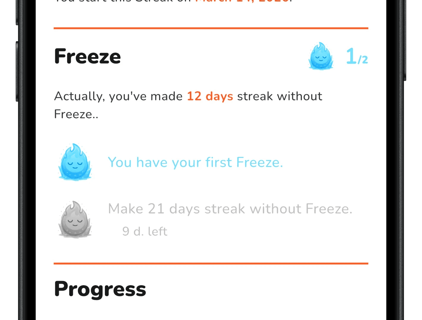 The Freeze system protects your long streaks. One off day doesn't erase weeks of effort.